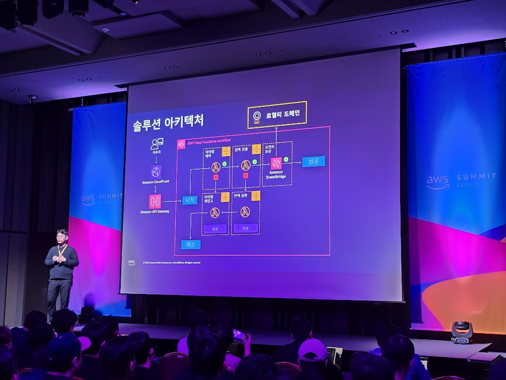 로열티 포인트를 추가를 예를 들어서 설명해 주셨다. 바운디드 컨텍스트를 사용하여 구매 결제 성공 시 로열티 포인트를 지급하는 기능을 추가하는 것이었다. Saga 오케스트레이션 분산 디자인 패턴을 사용하는 방식을 소개해 주셨고, 처음 듣는 디자인 패턴이라서 꽤 흥미로웠다. Amazon Lambda와 Amazon EventBridge를 사용해서 어떤 방식으로 처리되는지 이미지로 보여주어서 이해하기 수월했다.